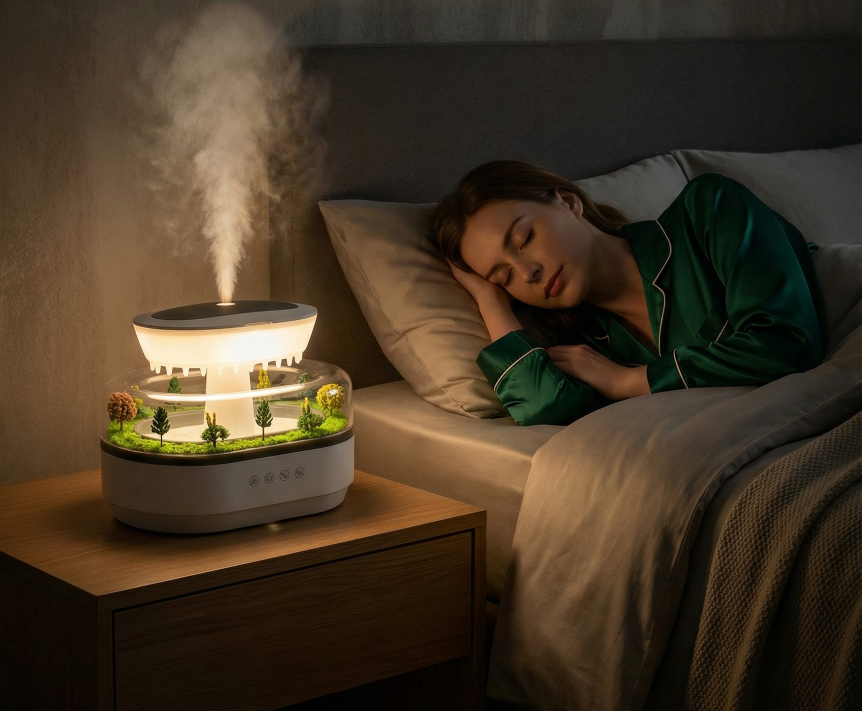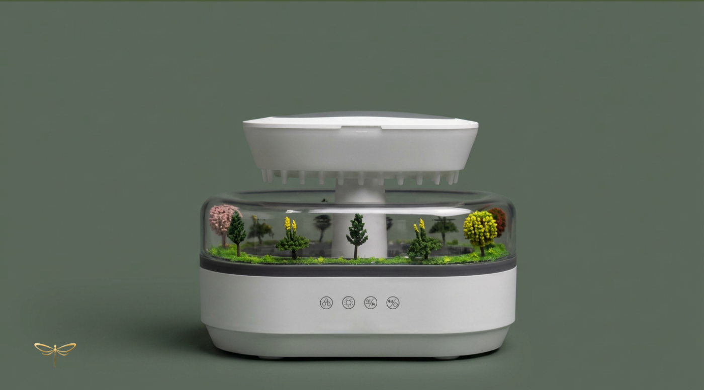 A quiet rhythm of rain and fine mist, designed to soften the room and support slower nights.