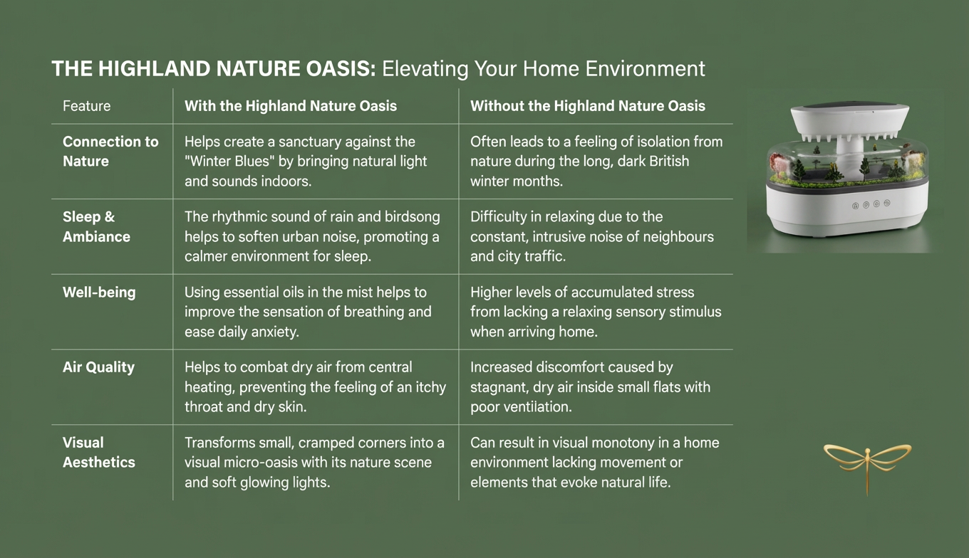 The fine mist lightly humidifies the air, helping to reduce dryness and that heavy, enclosed feeling common in heated indoor spaces and city flats.